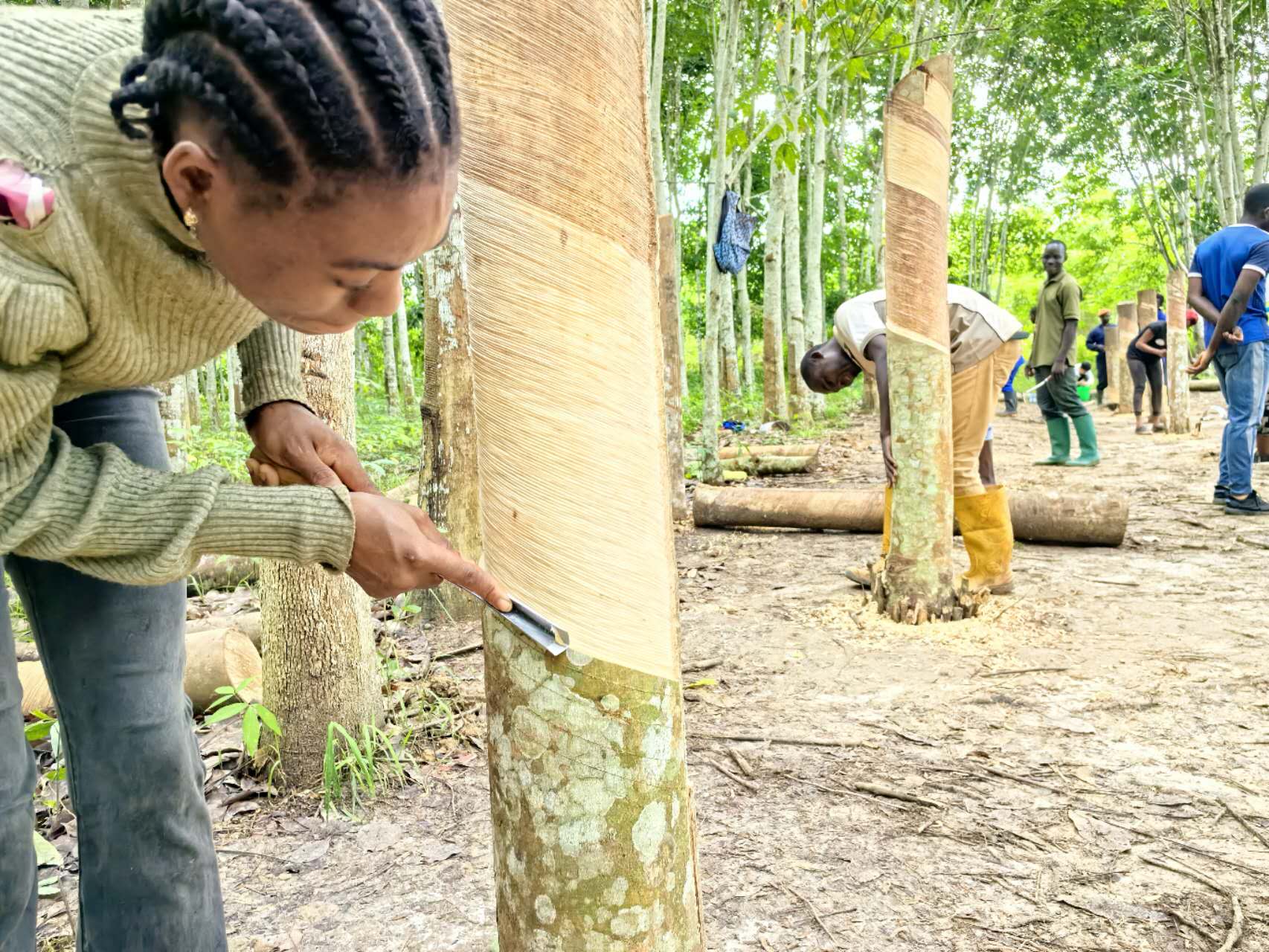 近日,海南橡膠首批赴非專家團在喀麥隆Sudcam和Hevecam兩大種植園開展割膠技術(shù)培訓(xùn)。自4月1日起,專家們開始教授海南橡膠的推刀技術(shù),經(jīng)過短短8天時間,參與培訓(xùn)的20名當?shù)啬z工已經(jīng)熟練掌握了低割線與中割線的操作要領(lǐng)與技術(shù),初見培訓(xùn)成效。 專家團成員雷福生向當?shù)啬z工演示推刀割膠技巧。